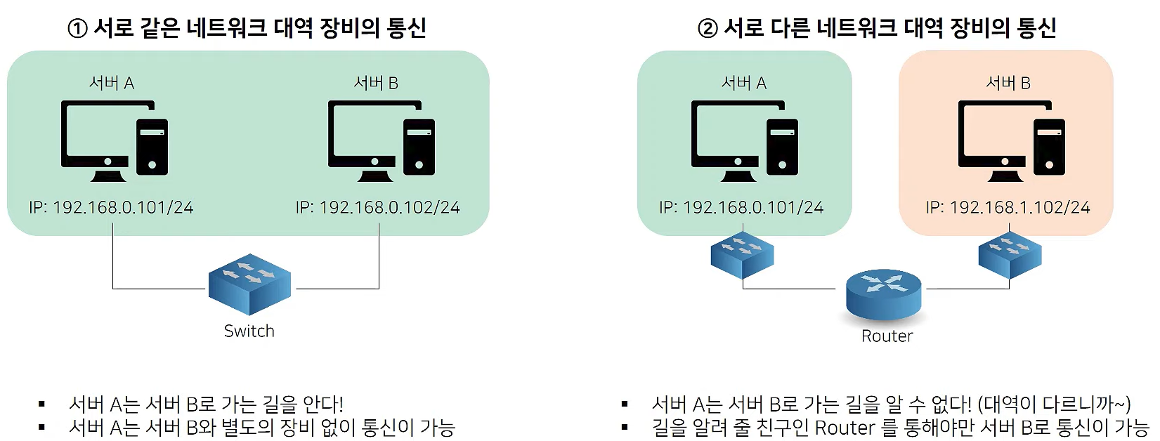 다른대역대는 (서브넷 기준) 라우터 장비가 있어야만 서로간 통신이 가능해진다.