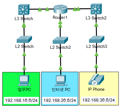 위 내용은 스위치를 따로 구성하여 네트워크 대역을 구분했을때에 대한 설명으로
