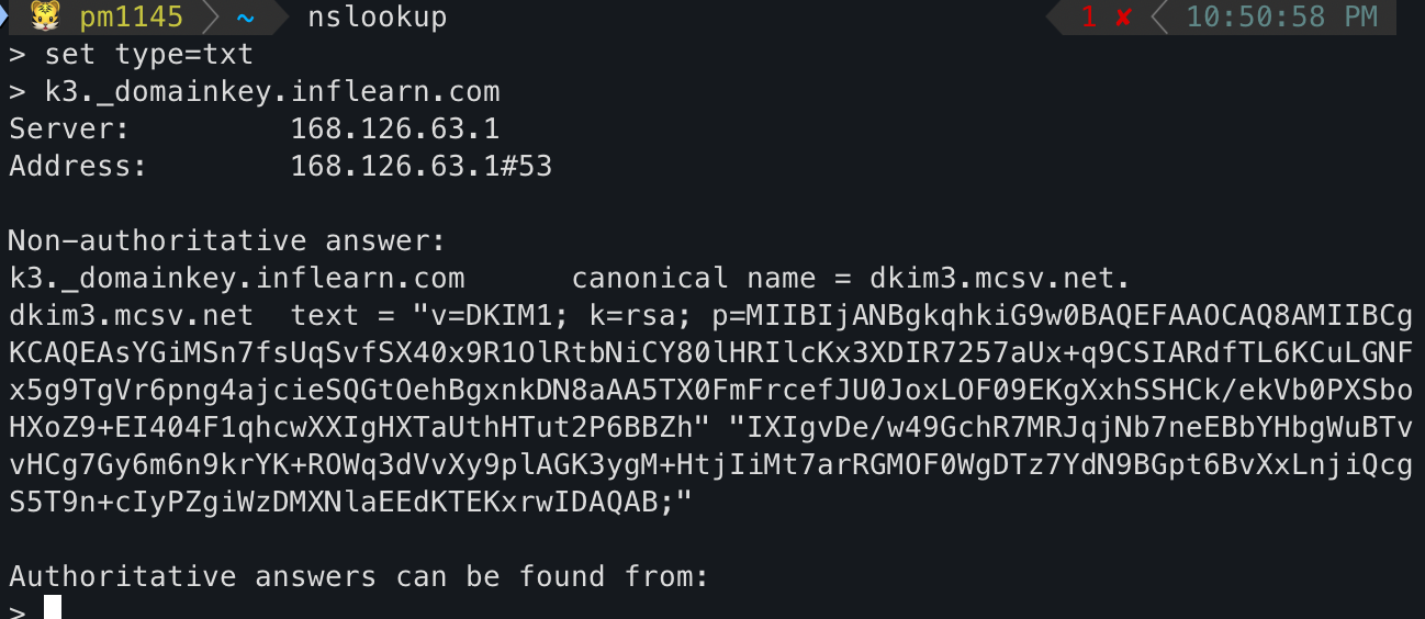 nslookup -q=txt <selector>._domainkey.<domain> 을 입력 하면 된다.