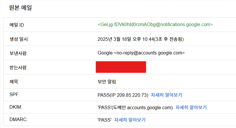 이메일에서 원문보기를 클릭하면 위와같이 SPF, DKIM, DMARC 인증을 확인 할 수 있다.