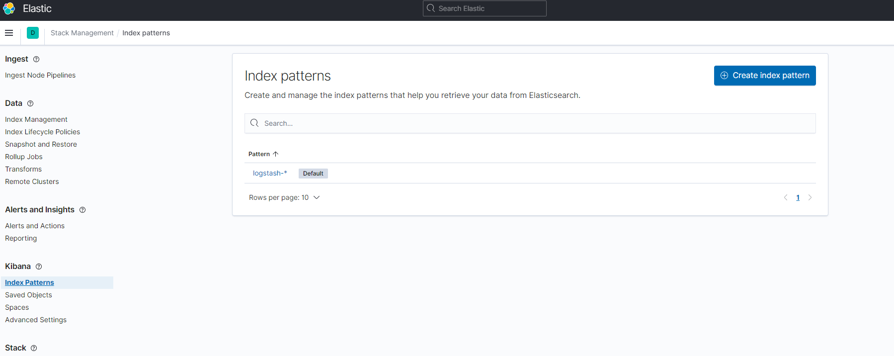 kibana UI에 접속, Management > Stack Management > Kibana > Index Patterns