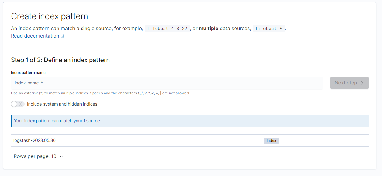 아래 Your index pattern can match your 1 source. 라며 등록 가능한 index pattern을 보여준다.
