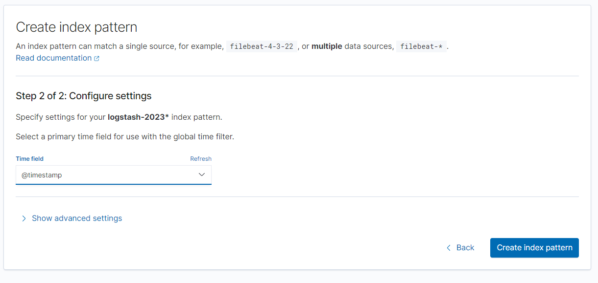 Configure settings 에서는 Time fileld를 @timestamp 로 선택하여 index pattern 생성을 완료한다.