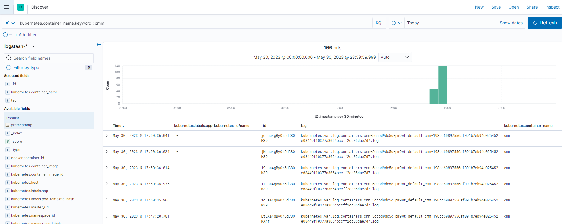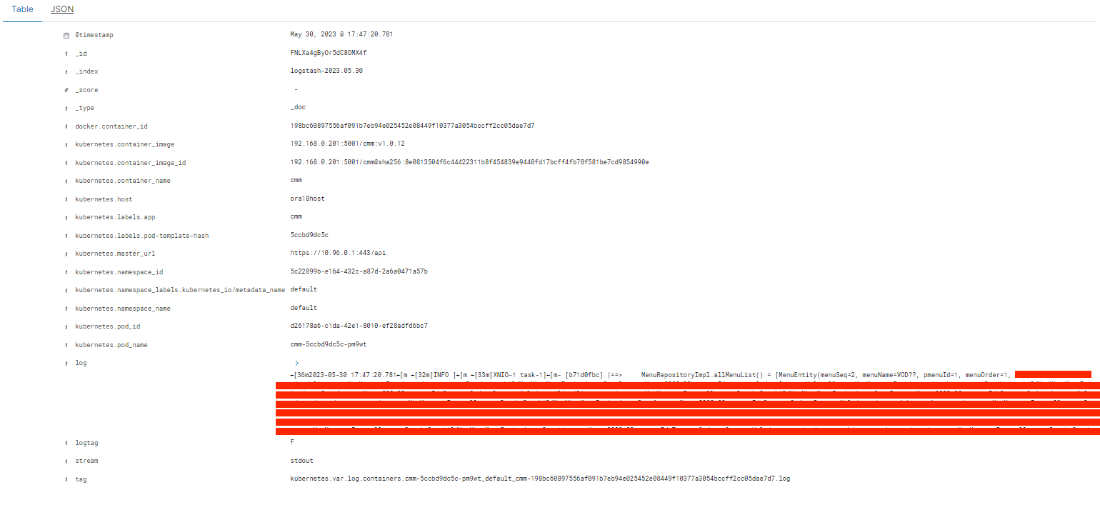 Kibana > Discover 에서 아래와 같이 원하는 조건, 시간으로 수집된 로그를 UI로 확인 할 수 있다.