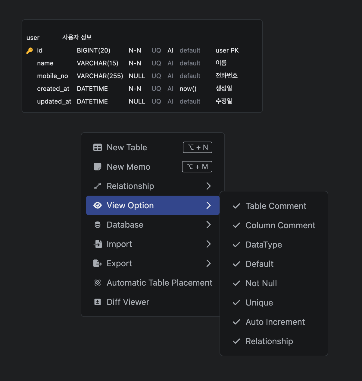 - DBMS 툴 자체적으로 제공되는 ERD 기능을 검토했으나, 파일 기반으로 되어있어 실시간 동기화를 보장하기에 어려움이 있어보였다.