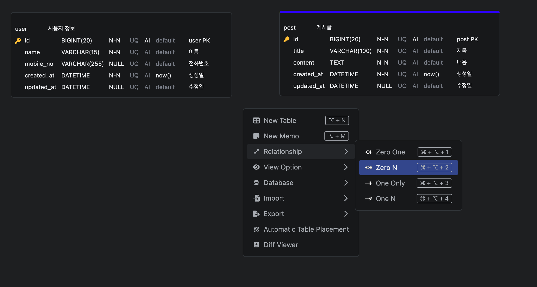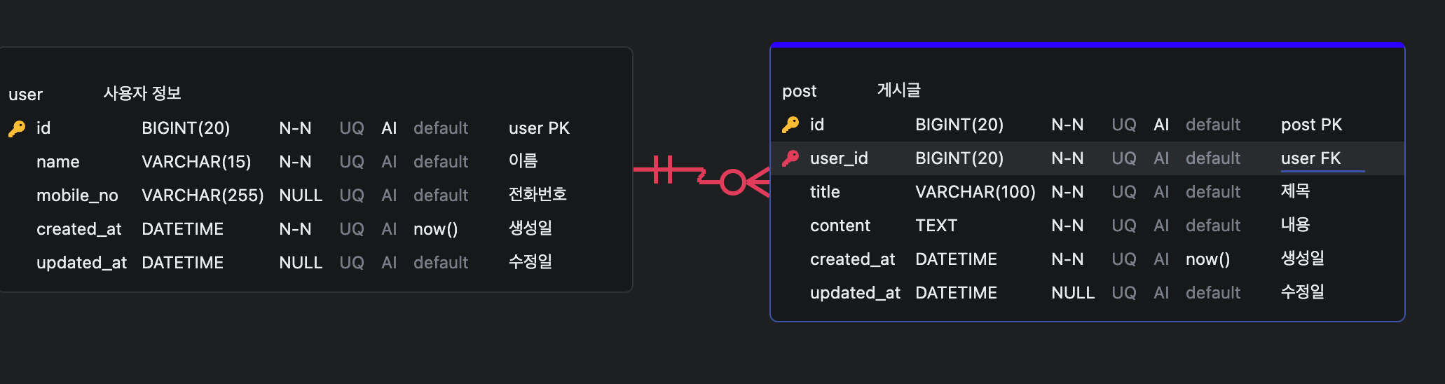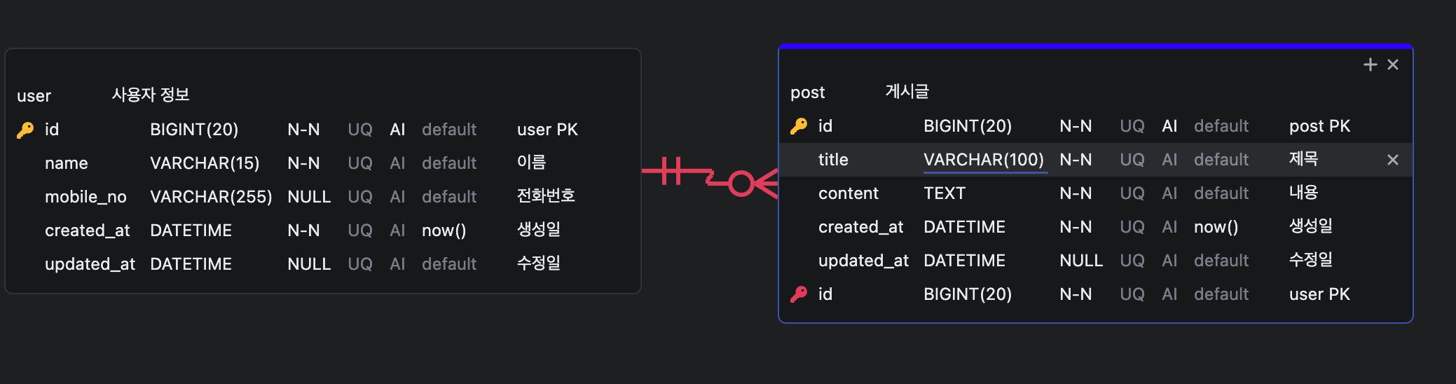user 를 먼저 클릭 후 post 를 클릭하면 위와 같은 연관관계 선이 그려진다.