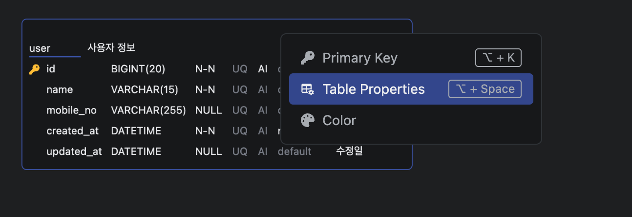 테이블에서 우클릭 하면 테이블의 상세 설정을을 확인할 수 있다.