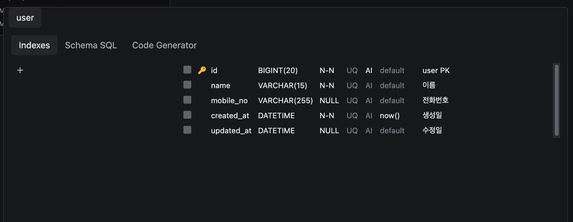 | 컬럼명 | 컬럼 타입 | N-N : Not Null NULL : Null | Unique Key | Auto Increment | 기본값 | 컬럼 정보 (설명) |