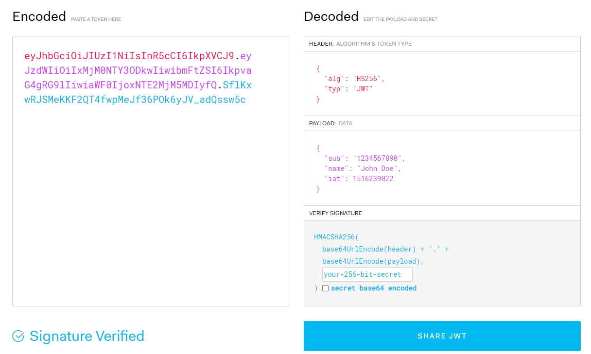 https://jwt.io/ 에서 토큰을 디코딩, 검증 해볼 수 있으며 아래와 같이 token 내용은 3개로 구분된것을 확인 할 수 있다.