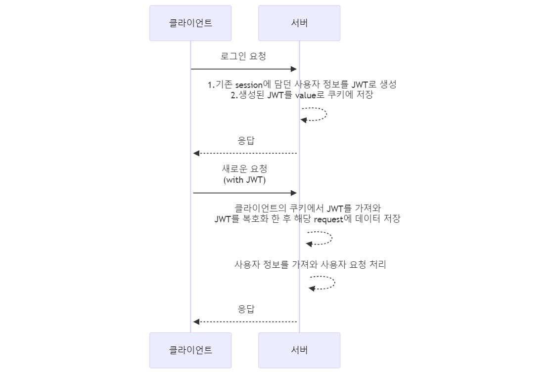 생성된 JWT를 쿠키에 담을지, 세션에 담을지, localstorage에 담을지는 많은 관점이 존재한다. 편의상 쿠키에 담는것으로 작성된 다이어그램클라이언트가 브라우저 쿠키에서 확인할 수 있는 JWT 데이터