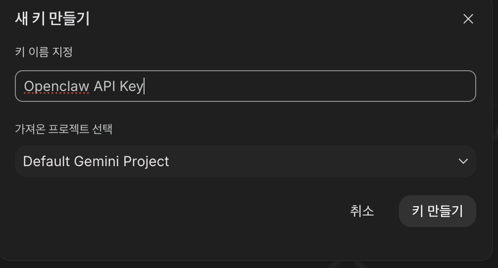 우측의 API 키 만들기 버튼을 클릭하여 새로운 키를 하나 생성한다.
