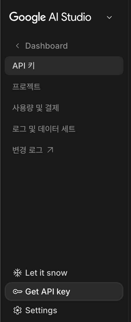 gemini 무료 계정의 API 키를 연동하기 위해 Google AI Studio에 들어가서 API 키를 발급받는다.