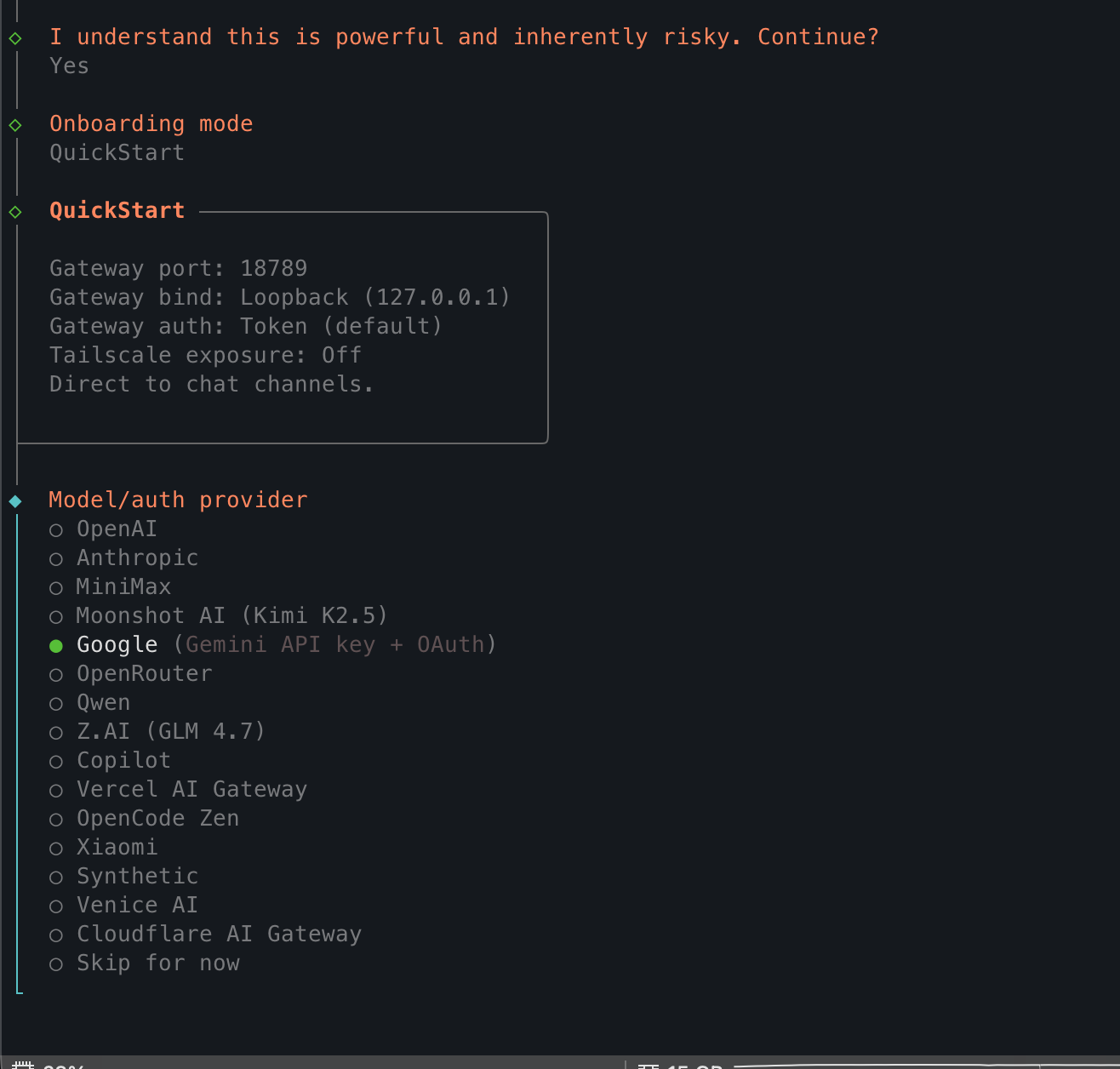 QuickStart 모드로 선택 후 Google 모델로 선택