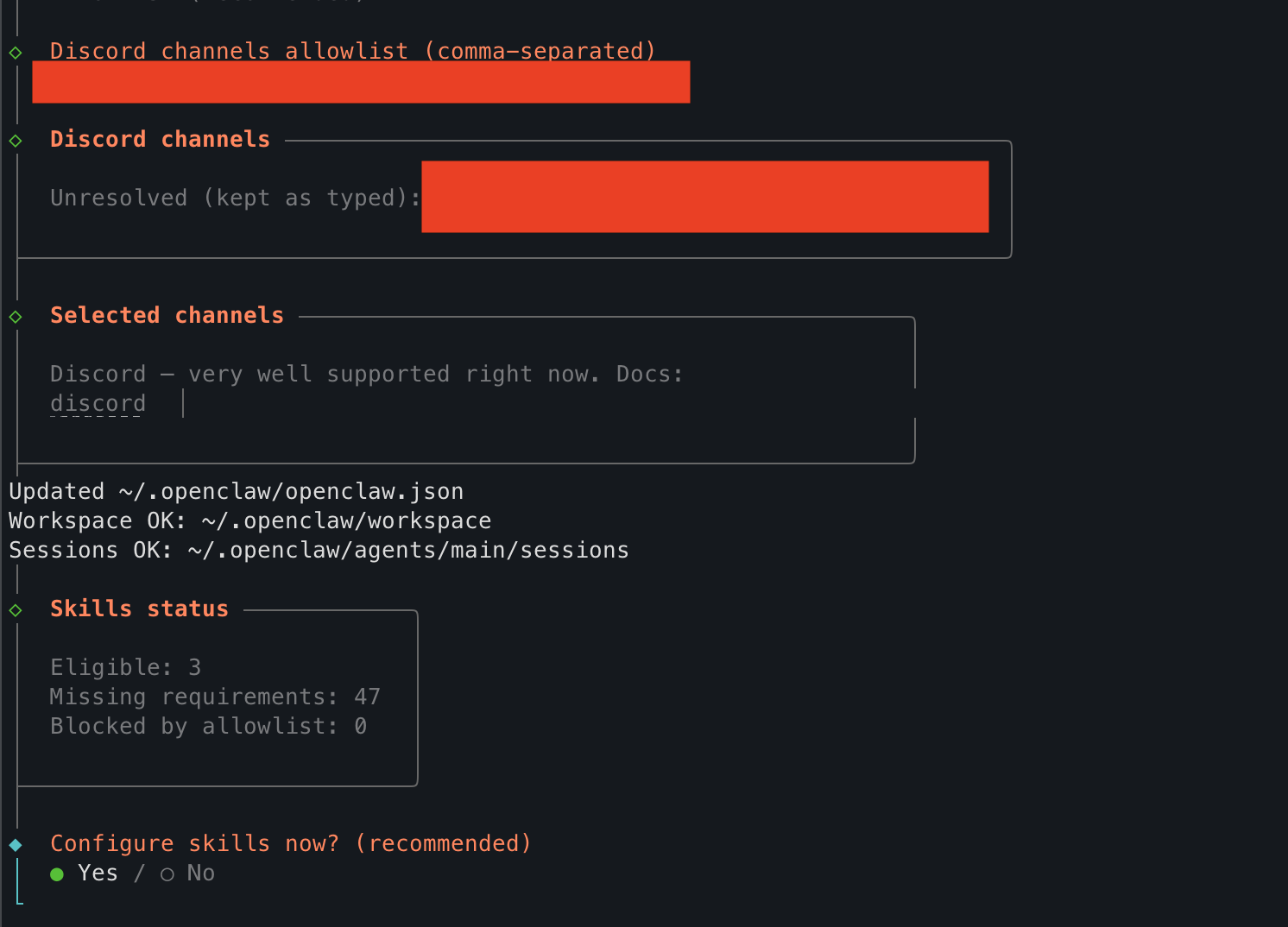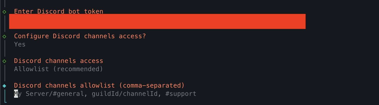토큰 입력 후 순서대로 Yes, Allowlist 선택 한 뒤 봇이 추가된 서버명과 채널명을 집어넣는다