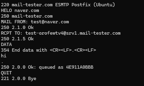 - 서버와 연결 되었다면 SMTP 표준 명령어들을 이용해 발신자-수신자-내용-종료 순으로 통신한다.