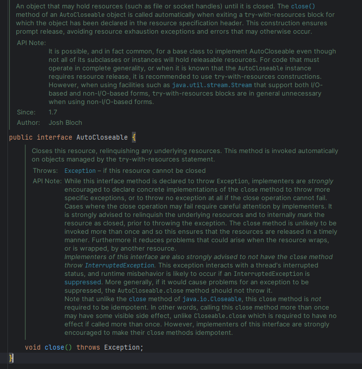 위 예시에서 사용된 BufferReader와 FileReader 는 타고 들어가면 Reader 라는 추상 클래스를 이용해 구현했는데 상속받은 Closeable 인터페이스가 AutoCloseable 를 상속받은 인터페이스임을 확인 할 수 있다.