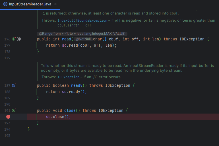 자원 해제가 정상적으로 수행되었는지는 InputStreamReader 객체내 close() 에 브레이크 포인트를 잡고 각 테스트마다 확인하였음